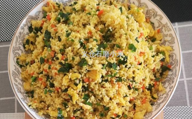 4.炒鍋放油適量,油熱放蔥花姜末,炒出香味入胡蘿卜丁翻炒幾下,加少量鹽,五香粉,胡椒粉,然后加入小米,不斷翻炒并按壓炒散小米,再放入韭菜或蒜苗,繼續(xù)翻炒出韭菜或蒜苗香味,*后放鹽即可出鍋。